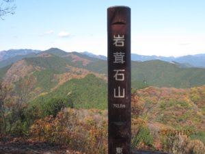 紅葉を楽しみながら岩茸石山に着く。目に入る山々の色付きが見事。素晴らしいロケーション三座同定を試みたが持って行った地形図が狭く残念。