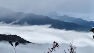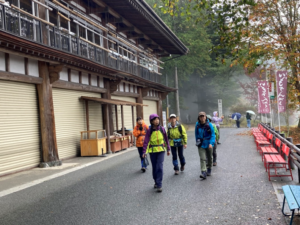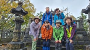 三峰神社バス停に着くと雨で平日なのにそれなりに人がいて人気の場所だという事が分かります。バス停に着いたら雨が止んでいたのでそこからは予定通り妙法ヶ岳に登ることにしました。途中、隣の山の中腹に雲が立ち込めていて何とも言えない風景に巡り会ったので、皆思い思いにスマホのシャッターを切りました。この幻想的な風景に巡り会えたのは、天気の悪い中登山をしている私たちへのご褒美だと思いました。妙法ヶ岳は三峰神社の奥宮で、幾つか鳥居をくぐり抜け、根っこの道、岩の転がる道を登って行きましたが、途中で裸足で登る女性を見かけました。以前個人で来た時もその女性が裸足で登っていたのを見かけたので、願掛けでもしているのかしら?と思いました。