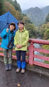 小雨が降ったり止んだりの空模様でしたので、電車に乗っているときから臨機応変で行きましょうという事になりました。予定の大輪バス停で下車したものの歩き出す前に降ってきてしまい、もう一度バスに乗り直して三峰神社バス停まで行くことにしました。そのバスを待っている間に登竜橋まで行って橋の上から見える絶景を楽しんできましたが、橋の上にクマ目撃の大きな看板があり驚きました。